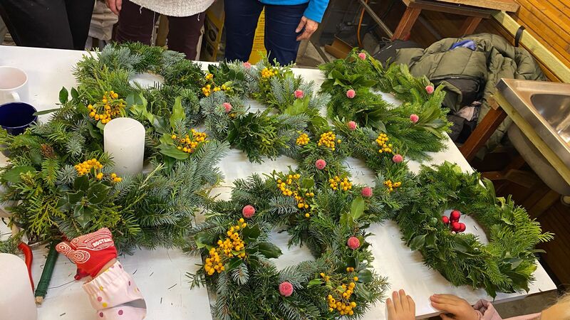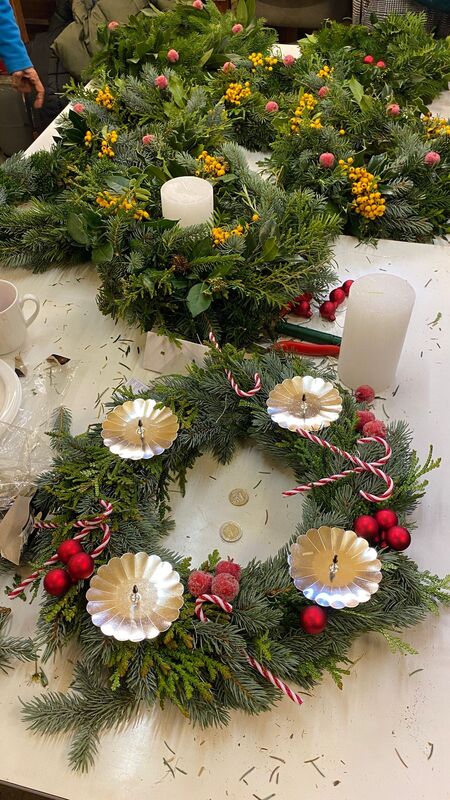 Nach dem Zuschneiden verschiedener Nadelholz- und anderer Zweige entstanden unter fachkundiger Anleitung von Regina Weyhersmüller schnell kleine individuelle grüne Kränze.